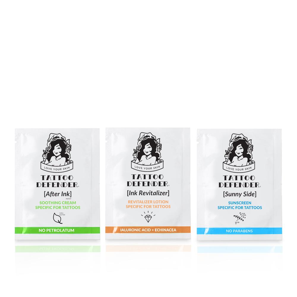 Questo pack unisce i tre prodotti della linea Tattoo Defender utili per tutte le fasi della vita del vostro tatuaggio. Si rivolge a tutti coloro che stanno per farsi un nuovo tatuaggio e desiderano averne la massima cura, per poi mantenerlo intatto nella sua bellezza per tutta la vita, evitando che i tratti perdano di definizione e i colori sbiadiscano, e proteggerlo dal sole e/o a coloro che hanno già tatuaggi e vogliono ridare vita al colore e proteggerli dal sole