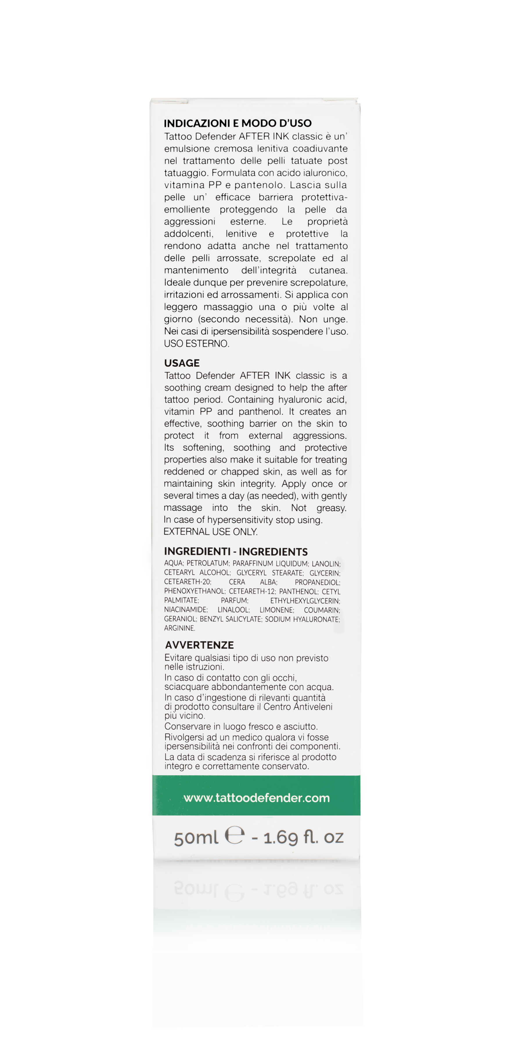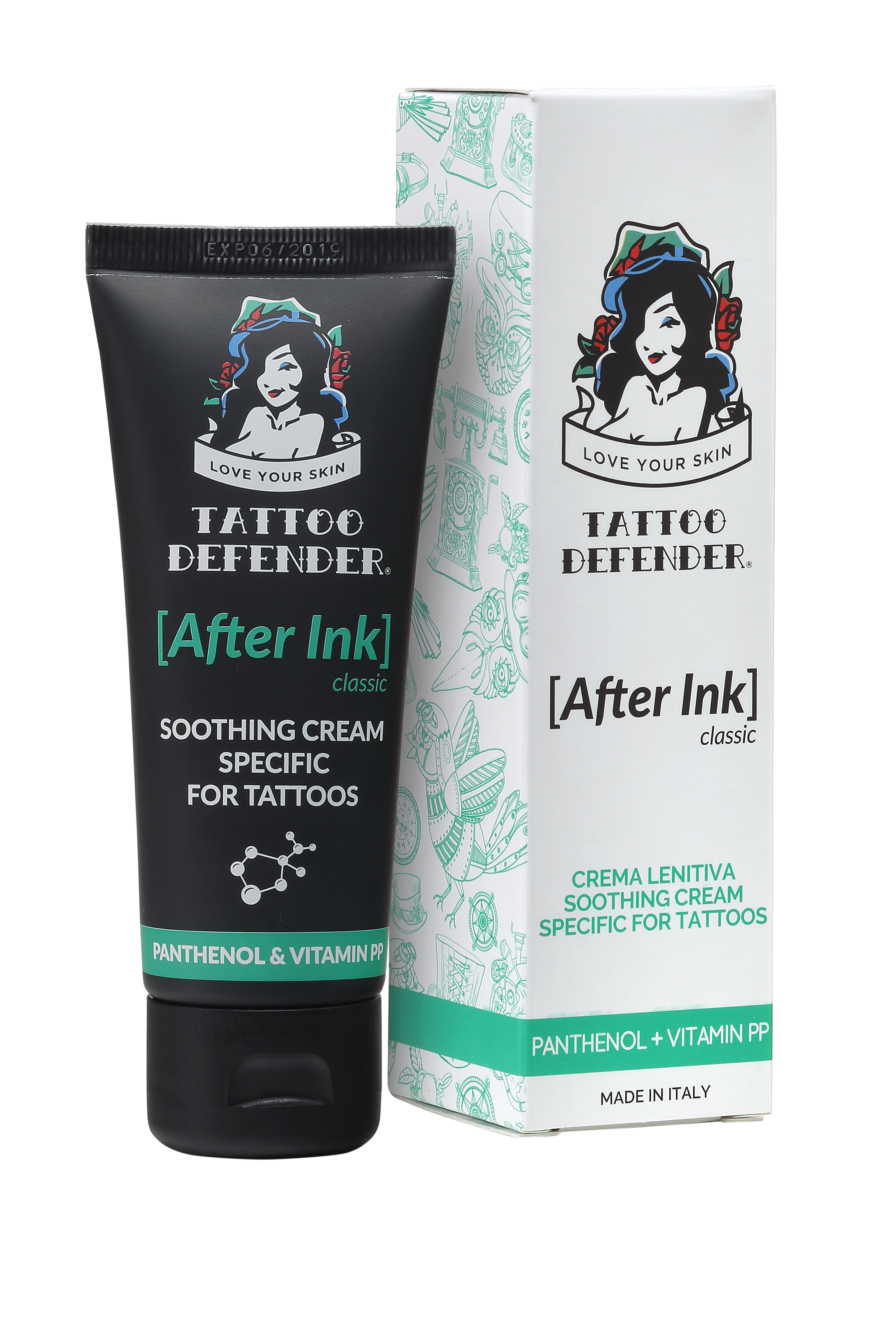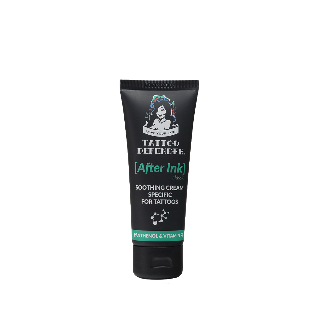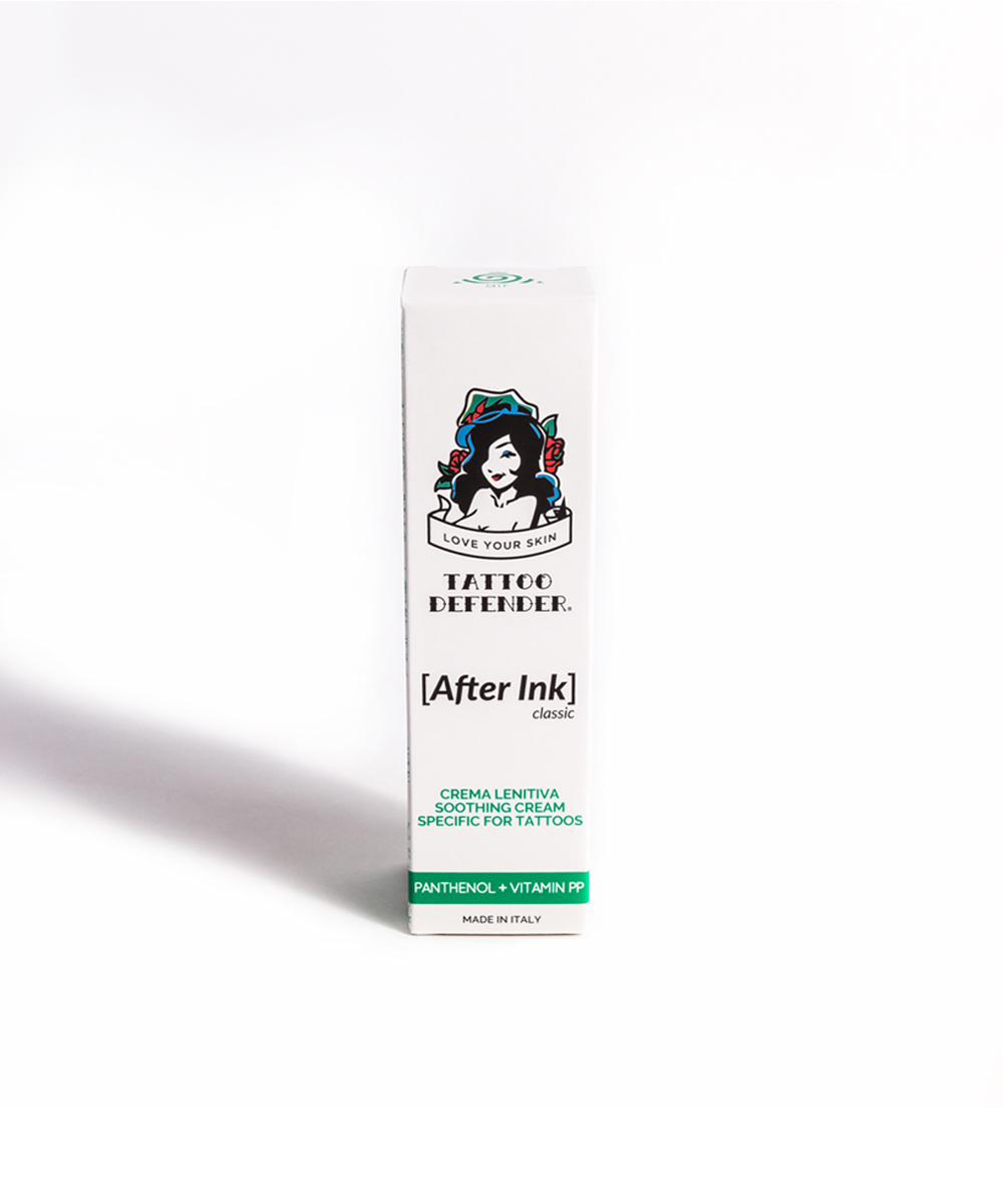 After Ink Classic di Tattoo Defender è una emulsione cremosa coadiuvante nel trattamento delle pelli appena tatuate. Essendo una crema lenitiva dotata di proprietà addolcenti e protettive, After Ink Classic è perfetto per i tatuaggi appena eseguiti, e ne assicura la guarigione in tempi rapidi. Va applicata con un leggero massaggio nel periodo successivo alla realizzazione del tatuaggio, cosicché possa formarsi la barriera protettiva-emolliente che protegge la cute e favorisce l’immediata guarigione.
